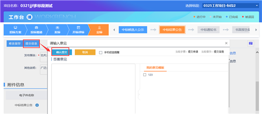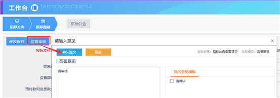 注意:采购文件、变更文件、评标情况环节(确定中标人)需先提交给采购人账号审核确认后,再提交给电子监管系统备案。