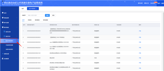 1、各环节信息提交后由电子监管系统审核或备案,其中交易公告、成交公告需要审核,系统根据“项目登记”中的“交易发生行政区域”推送对应的主管部门。