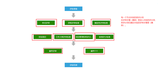 每一个节点对应的是评分项名称,在评审步骤(横排)里录入对应的评分项则评分项归属在对应的评审步骤里(横排):