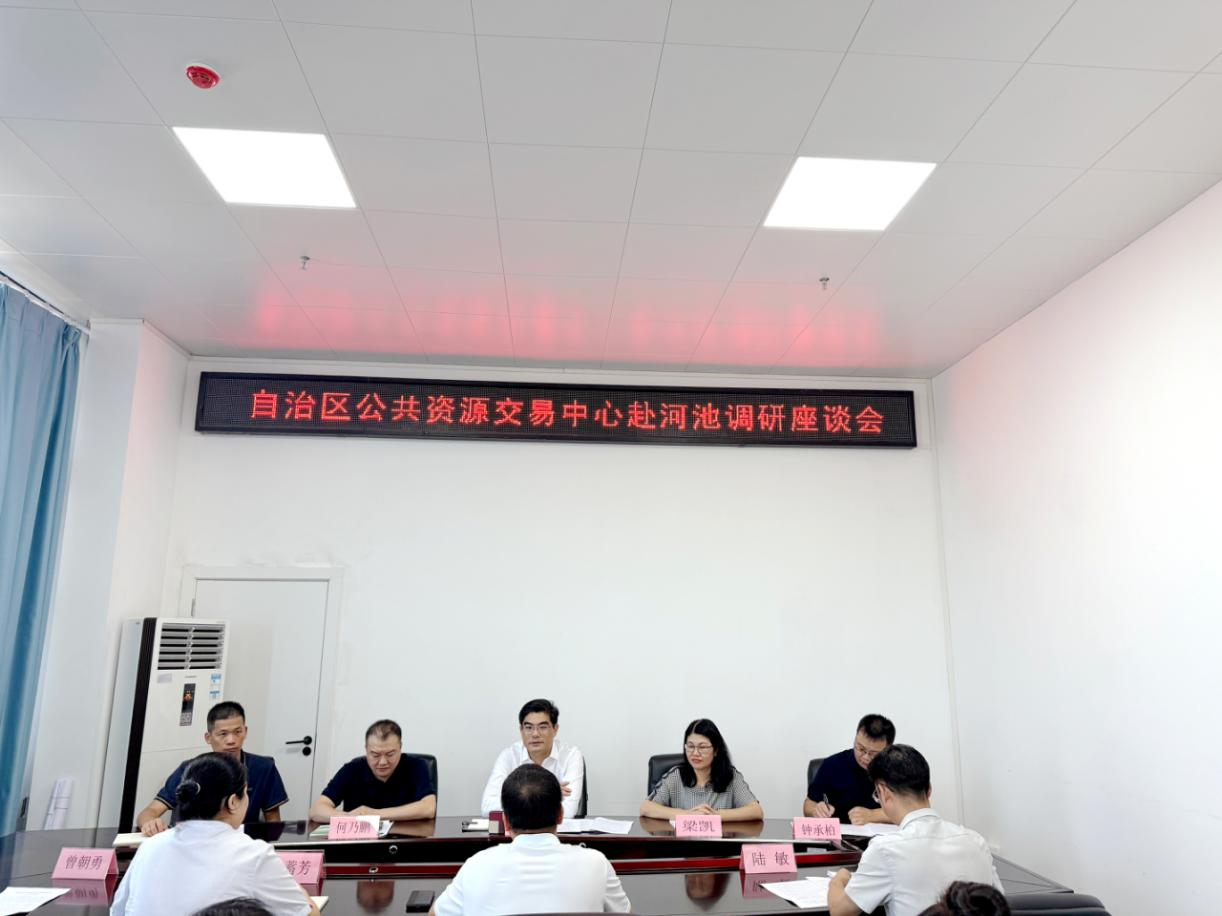 调研组实地走访了市公共资源交易中心开标区、评标区等功能区域,深入了解平台日常运行机制、服务流程优化措施、人工智能技术在交易环节的应用实践以及辅助监管体系建设等情况。在随后召开的座谈会上,调研组认真听取了河池市公共资源交易工作情况汇报,对我市在推进平台整合共享、提升服务效能、创新监管模式等方面取得的阶段性成效予以充分肯定,并就当前工作中存在的困难与问题提出了具有针对性的指导意见。