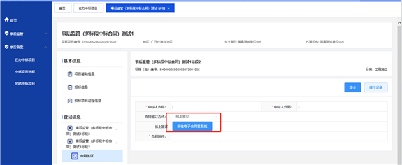 5、电子合同(中标合同)由招标人在事后监管系统发起,在“在办中标项目”中合同签订详情页面选择线上签订合同方式,再点击“跳转电子合同签系统”进行合同签订。