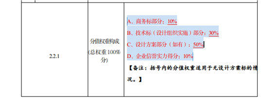 以设计标为例,招标文件专用范本设置时,其各部分分值权重为: