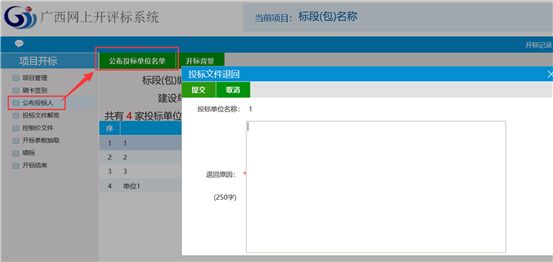 资格评审过程中,如有投标单位不符合资格评审要求的,可对其进行否决投标操作,选择否决投标节点和否决投标原因,点击“否决投标”按钮,如图: