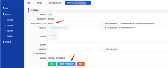 1、电子合同(代理合同)由招标人在事前监管系统发起,招标项目详情页面选择代理机构,选择线上签订招标代理合同签订方式,再点击“跳转电子合同签系统”进行合同签订。