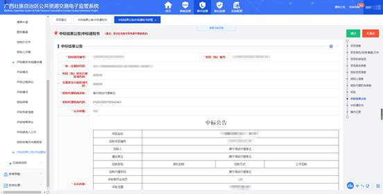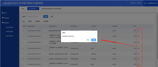 1、各环节信息提交后由电子监管系统审核或备案,其中交易公告、成交公告需要审核,系统根据“项目登记”中的“交易发生行政区域”推送对应的主管部门。