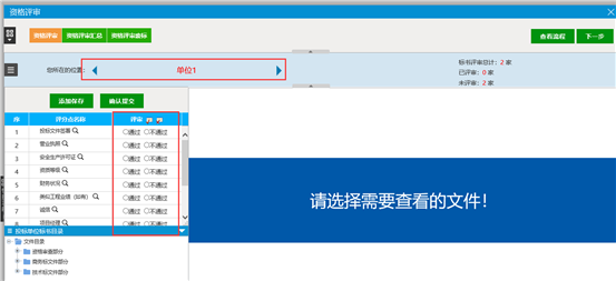 资格评审过程中,如有投标单位不符合资格评审要求的,可对其进行否决投标操作,选择否决投标节点和否决投标原因,点击“否决投标”按钮,如图: