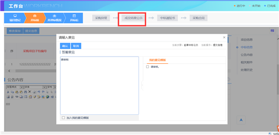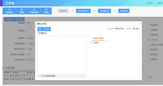 如需要预公示,需在采购预公示菜单编辑公告内容,提交给电子监管系统自动备案通过后,直接推送至外网公示。