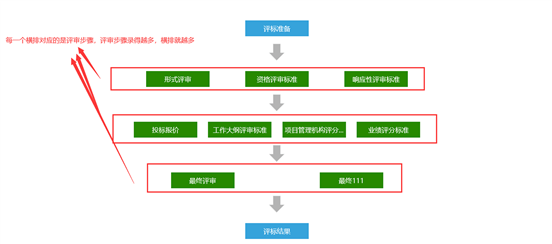 每一个节点对应的是评分项名称,在评审步骤(横排)里录入对应的评分项则评分项归属在对应的评审步骤里(横排):