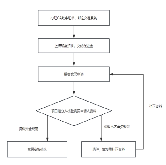 (2)竞买资格确认。项目经办人审阅相关资料。如资料齐全,内容规范,符合网上竞价文件要求的,受理其竞买申请,经部门负责人复审后办理竞买资格确认;如资料不齐全或内容欠规范的,作退件处理,并一次性告知其所需补正的资料。
