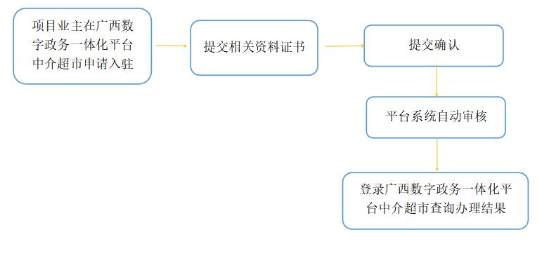 1.注册。项目业主凭统一社会信用代码证书在“广西数字政务一体化平台中介超市”申请入库、委托人凭项目业主委托授权书申请入库。自然人类型的项目业主入驻填报信息包括姓名、证件类型、证件号码、证件地址等;法人、非法人组织类型的项目业主入驻填报信息包括单位名称、统一社会信用代码、注册地、法定代表人或负责人等。