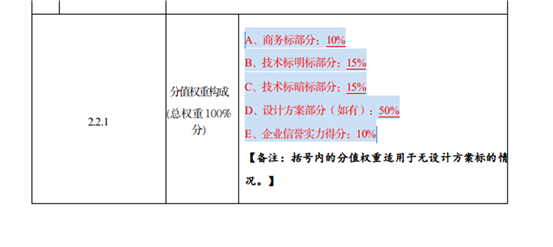 以设计标为例,招标文件专用范本设置时,其各部分分值权重为: