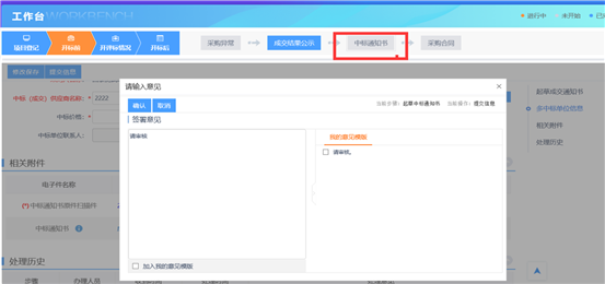 注意:采购文件、变更文件、评标情况环节(确定中标人)需先提交给采购人账号审核确认后,再提交给电子监管系统备案。
