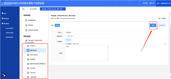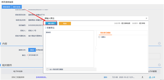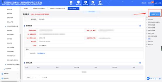 注意:采购文件、变更文件、评标情况环节(确定中标人)需先提交给采购人账号审核确认后,再提交给电子监管系统备案。