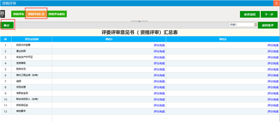 资格评审汇总由评委组长进行操作,如果所有评委均已评审完成,点击“确定”按钮进行汇总。如有问题需要退回重评的,经表决后,可进行“退回重评”操作。