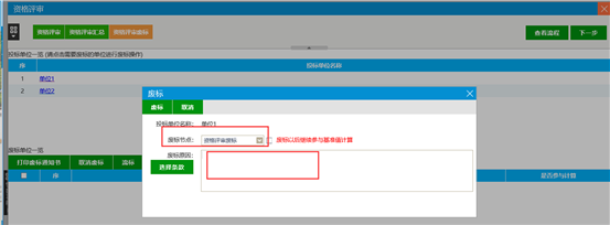 资格评审过程中,如有投标单位不符合资格评审要求的,可对其进行否决投标操作,选择否决投标节点和否决投标原因,点击“否决投标”按钮,如图: