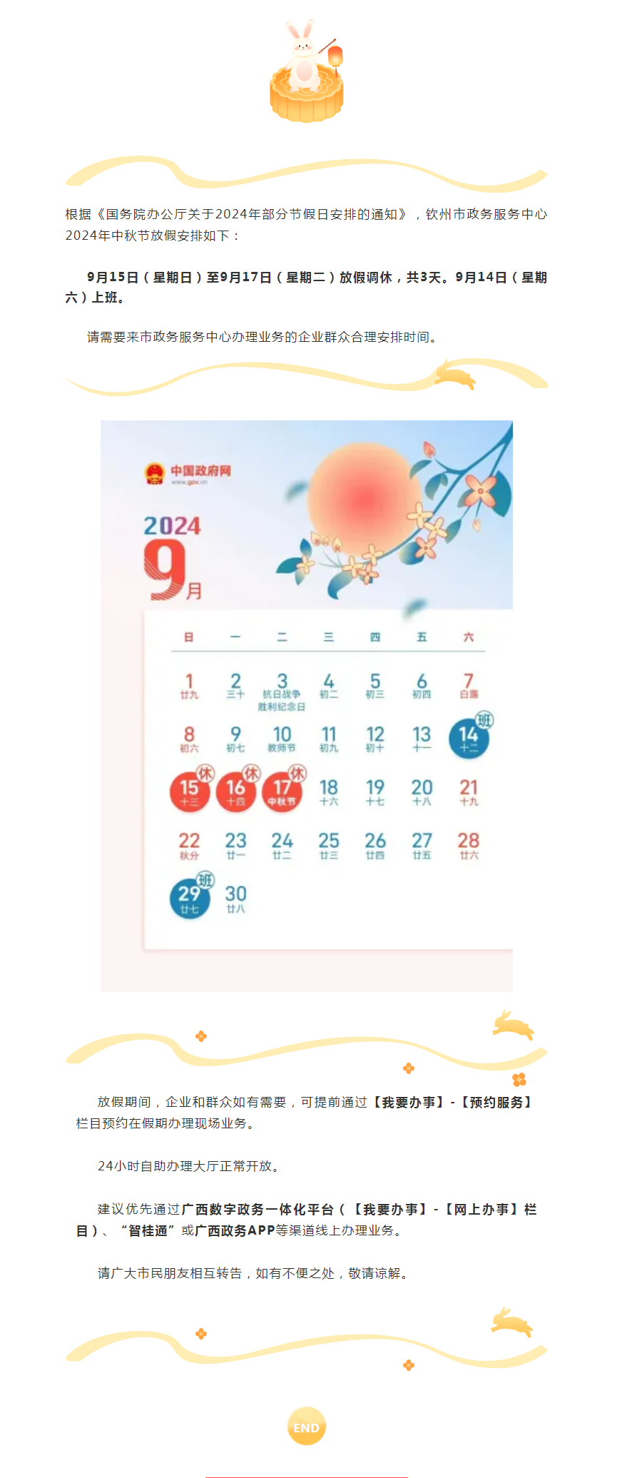钦州市政务服务中心关于2024年中秋节放假的通知